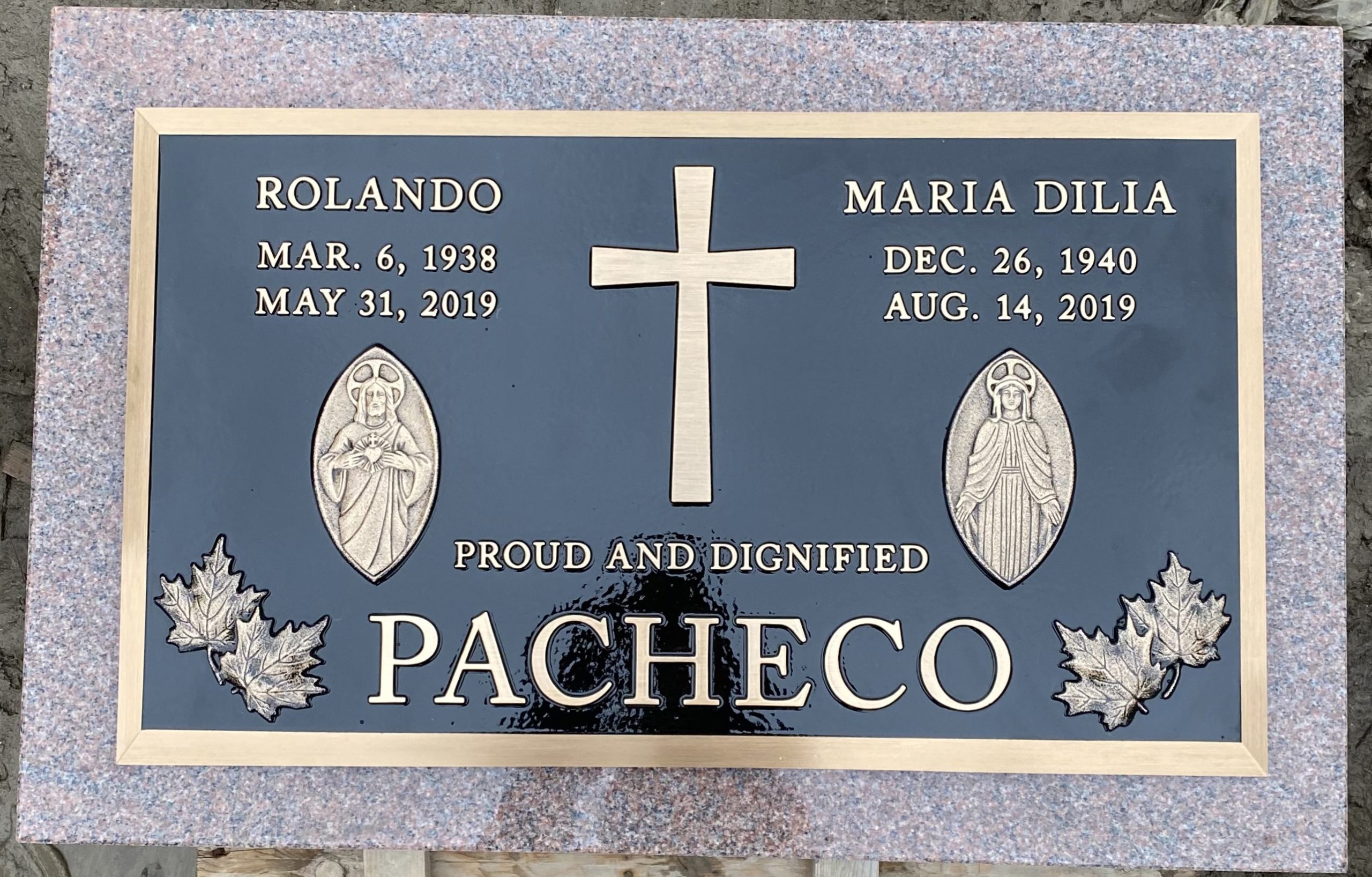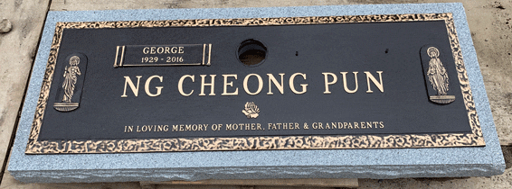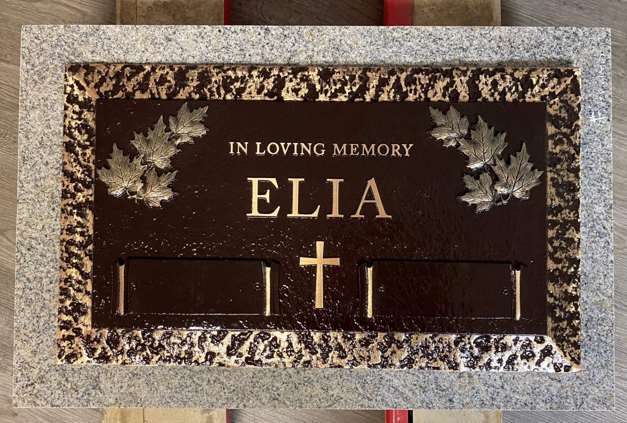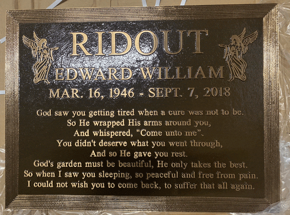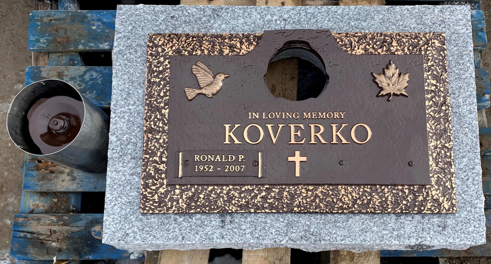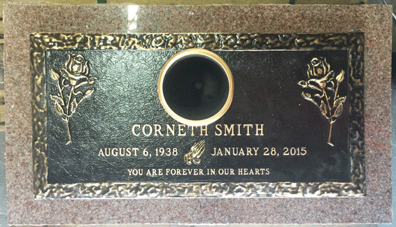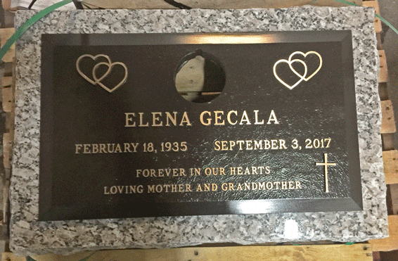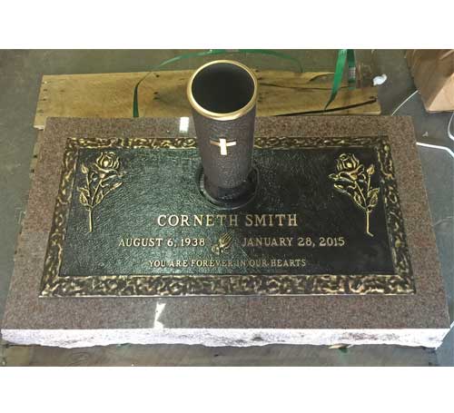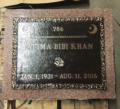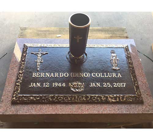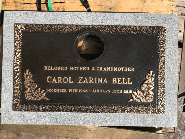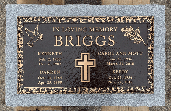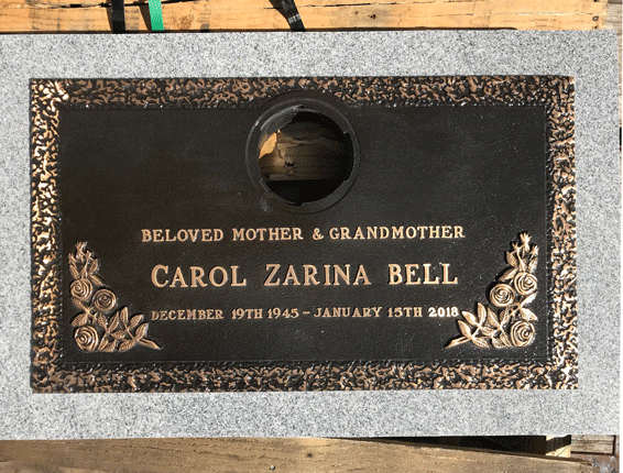 We are proudly Canadian-made bronze memorial plaques. Our standard bronze granite markers are made of high quality bronze attached to our standard light grey granite base. Bronze Granite Markers are an attractive alternative to the traditional upright headstones. Some cemeteries allow bronze with a granite base as an option, while at other cemeteries it is the only option. Verify with your cemetery if they permit granite bases, and if so, in what size and color. A standard granite base is four inches thick, and extends two inches beyond each edge of the bronze marker. Vase holes will be bored through the base for markers with built-in flower vases. Please keep in mind that granite is a natural occurring stone. The concentration and distribution of the various color components will vary with each piece of granite. If the cemetery request granite color other than those we offer, please contact us for a price quote.